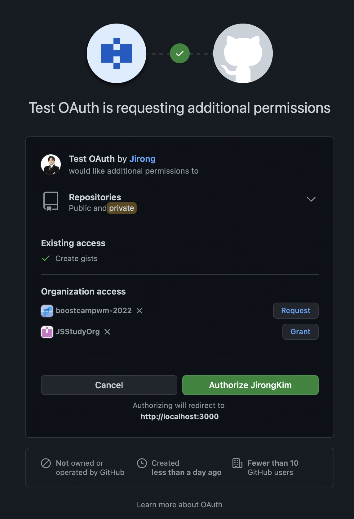 사용자가 Github에 로그인하고, 권한을 허용한다는 버튼을 누르면,