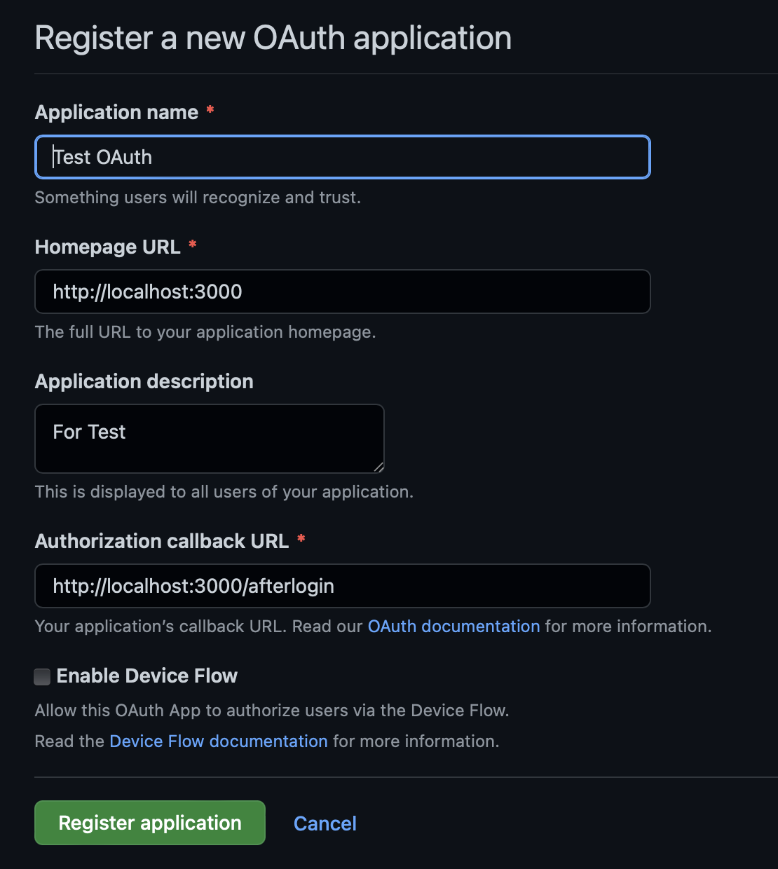위와 같은 순서로 Github OAuth Apps에 접근하여, 아래 정보를 입력하여 발행한다.