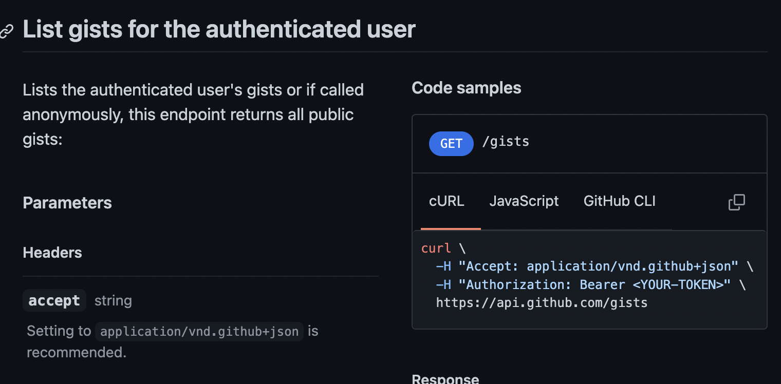 Github의 Rest API 문서를 뒤적이다보면, Gists라는 탭이 있다.