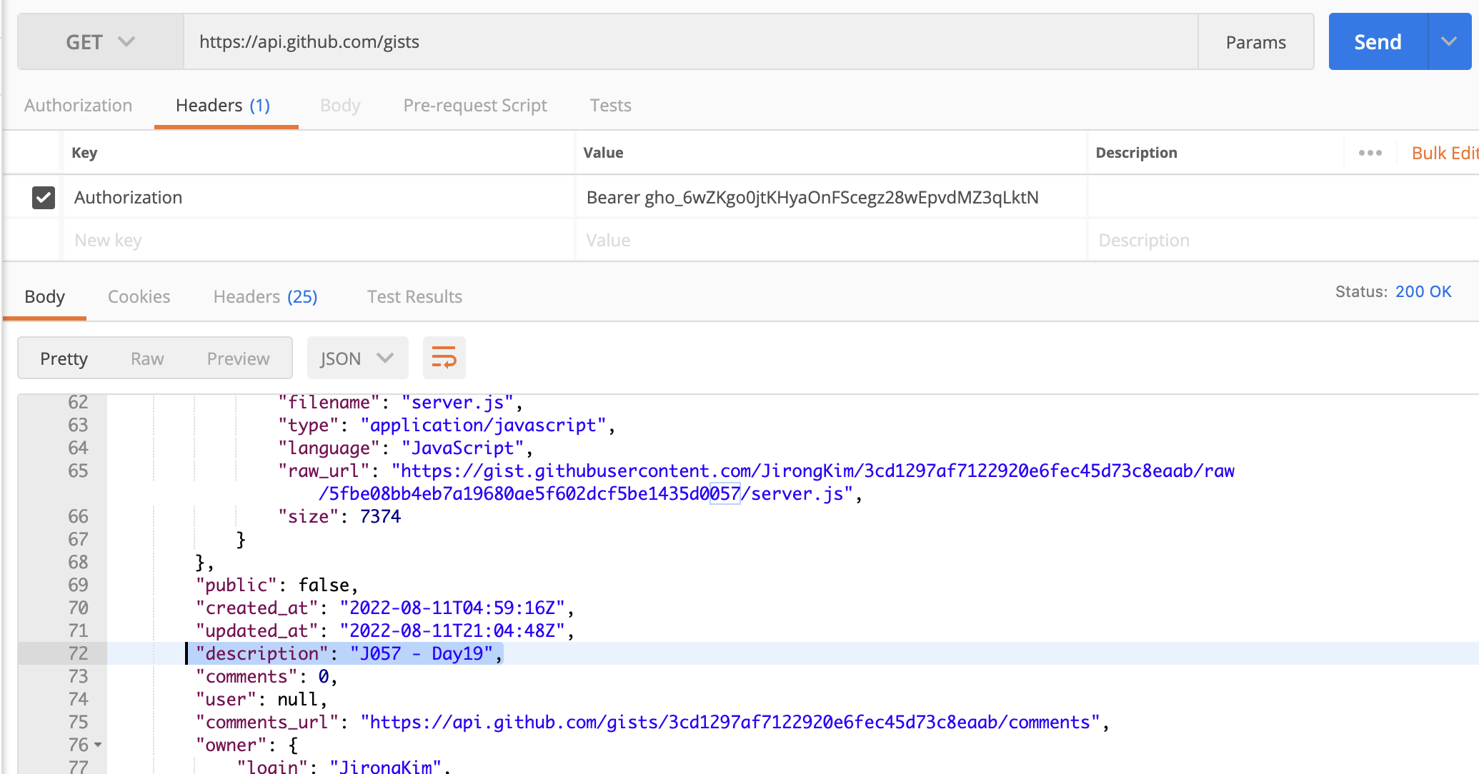 이대로 POSTMAN에 요청을 해보면, 사진과 같이 내 GIST 목록이 잘 나오는것을 확인할 수 있다.